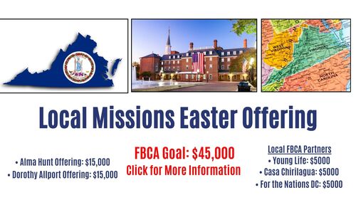 During the month of April, FBCA is hosting a Local Missions Offering which will be supporting missions in Virginia and specifically, Northern Virginia and Alexandria. FBCA's goal for the offering is $45,000 and will be distributed in the following manner: