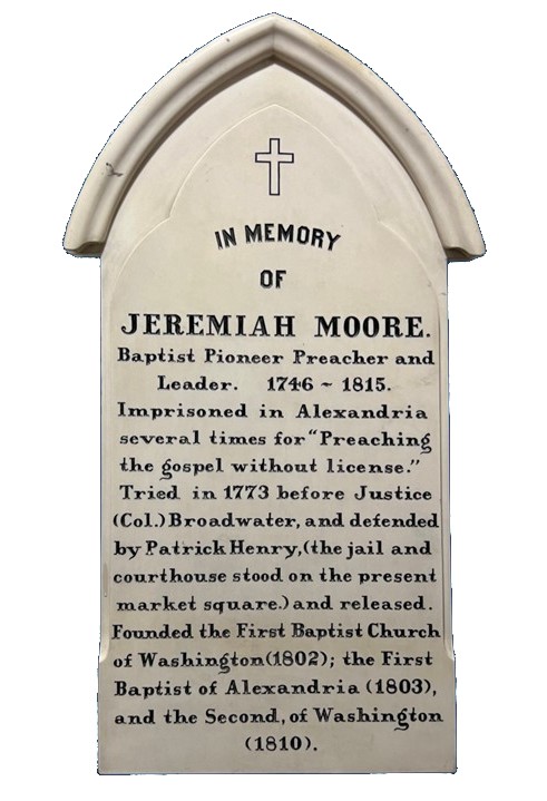 On April 16, 1803, five men and seven women of Back Lick Church in Fairfax County asked to be "dismissed agreeably...to be constituted into a regular Baptist Church in the town of Alexandria." Their request was approved, and a week later, the twelve signed a covenant in which they, "humbly desiring to be constituted into a regular church, hoping it may be for the glory of God...do hereby as in the presence of His Supreme Majesty, solemnly unite as a regular society to worship Him and promote His ordinances, maintain His truth and endeavor to promote His Glory in the world." The group, with $1,988.87 borrowed from a charter member, Alexander Smith, erected a humble meeting house and called Jeremiah Moore as their first pastor.